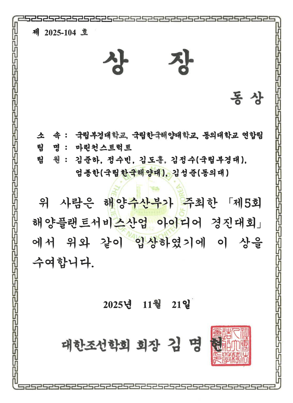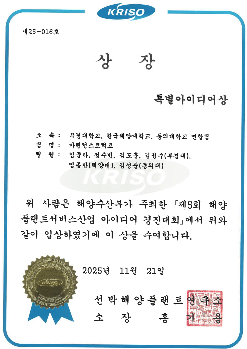 ** 해양플랜트 서비스산업 아이디어 경진대회 수상 내역 우리과 아래 학생들이 해양플랜트 경진대회에 출전하여 수상을 했다고 합니다. 많은 축하바라며, 앞으로도 있는 대회에 학생 여러분들의 많은 참여 바랍니다. 1. 참여팀원 : 마린컨스트럭터팀 - 김준하, 김정수, 김도훈, 정수빈, 엄종한, 김성준 (총 6명) 2. 지도교수 : 석우찬 교수 3. 수상내역 : 아이디어 경진대회 동상 및 특별 아이디어상 ------------------------------------------------------------------------------------ 국립부경대학교 조선해양시스템공학과 “마린 컨스트럭터”팀(대표 김준하, 3학년)이 2025년 해양플랜트 서비스산업 아이디어 경진대회에서 치열한 경쟁 끝에 동상 수상과 더불어, 전체 참가 팀 중 가장 독창적인 아이디어를 제시한 단 한 팀에게만 수여되는 특별 아이디어상을 동시에 수상하는 성과를 달성하였다. 해양플랜트 서비스산업 아이디어 경진대회는 해양수산부 지원사업의 일환으로 청년들이 해양플랜트 서비스산업*에 대한 관심을 높이고 창의적 역량을 발휘할 수 있는 대회이다. 부경대 팀은 해양플랜트 운송 과정에서의 효율성을 극대화하고 운용 안정성을 획기적으로 높일 수 있는 '차세대 하이브리드 해상 운송 시스템'을 제안하였다. 특히 기존 방식의 한계를 극복하기 위해 독창적인 연결 및 제어 메커니즘을 설계에 도입하였으며, 이를 통해 해상 작업 시 발생할 수 있는 불안정 요소를 효과적으로 제어하고 이송 정밀도를 높이는 혁신적인 솔루션을 선보여 심사위원들의 높은 평가를 받았다. 김준하 학생은 “서로 다른 강점을 가진 팀원들이 하나의 목표를 향해 달려가며 만들어낸