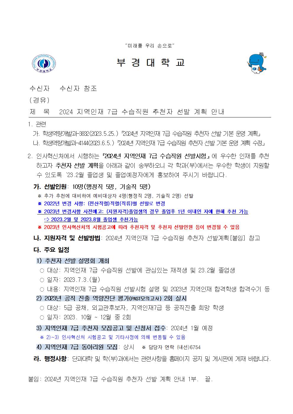 2024 지역인재 7급 수습직원 추천자 선발 계획 안내