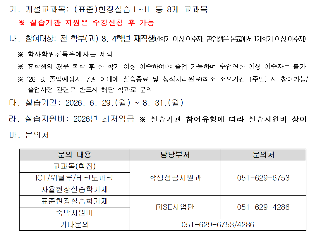 2026학년도 하계학기 현장실습학기제 참여 실습생 모집 안내